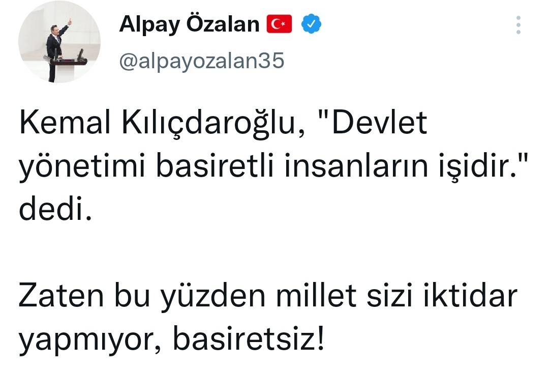Türkiye Büyük Millet Meclisi (TBMM) İdare Amiri ve AK Parti İzmir Milletvekili Alpay Özalan, CHP Genel Başkanı Kemal Kılıçdaroğlu'na ilişkin sosyal medya hesabından paylaşımda bulundu.