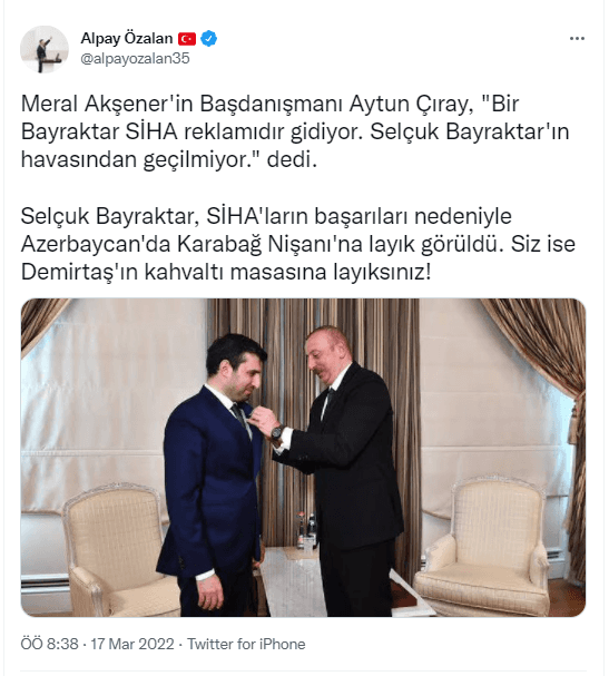 Meral Akşener'in Başdanışmanı Aytun Çıray, "Bir Bayraktar SİHA reklamıdır gidiyor. Selçuk Bayraktar'ın havasından geçilmiyor." dedi. Selçuk Bayraktar, SİHA'ların başarıları nedeniyle Azerbaycan'da Karabağ Nişanı'na layık görüldü. Siz ise Demirtaş'ın kahvaltı masasına layıksınız!