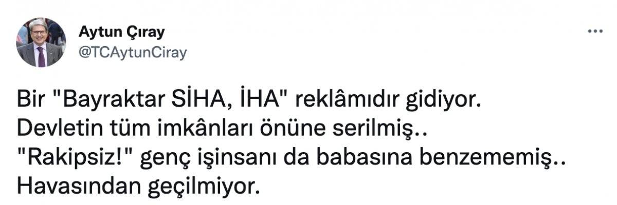İYİ Parti İzmir Milletvekili Aytun Çıray, dünyaca başarısı kanıtlanmış İHA ve SİHA'ların üreticisi Selçuk Bayraktar'ı hedef aldı. Twitter hesabından paylaşımda bulunan İP'li Çıray, "Bir 'Bayraktar SİHA, İHA' reklamıdır gidiyor. Devletin tüm imkânları önüne serilmiş... 'Rakipsiz!' genç iş insanı da babasına benzememiş.. Havasından geçilmiyor." dedi.