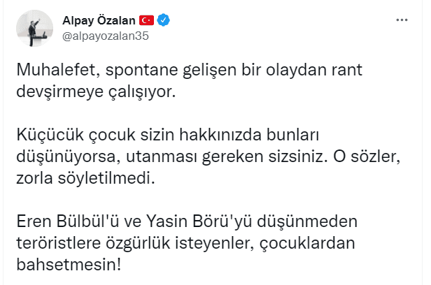 AK Parti İzmir Milletvekili Alpay Özalan, Trabzonlu bir çocuğun CHP Genel Başkanı Kemal Kılıçdaroğlu'na yönelik sözlerinden sonra, Cumhurbaşkanı Recep Tayyip Erdoğan'ın hedefe konmasını eleştirdi. Özalan, "Küçücük çocuk sizin hakkınızda bunları düşünüyorsa, utanması gereken sizsiniz." dedi.