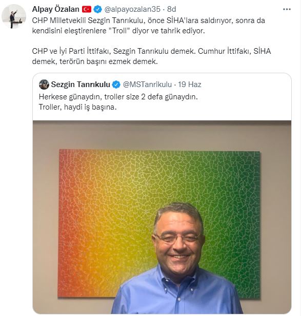 Terör örgütü PKK’nın paçavrasını oluşturan renklerin önünde fotoğraf çektirip, “Herkese günaydın, troller size 2 defa günaydın. Troller, haydi iş başına” ifadeleri ile sosyal medya hesabı üzerinden paylaşım yapan SİHA Sezgin’e, AK Parti İzmir Milletvekili Alpay Özalan tepki gösterdi. Özalan sosyal medya hesabı üzerinden yaptığı paylaşımda, “CHP Milletvekili Sezgin Tanrıkulu, önce SİHA'lara saldırıyor, sonra da kendisini eleştirenlere "Troll" diyor ve tahrik ediyor. CHP ve İyi Parti İttifakı, Sezgin Tanrıkulu demek. Cumhur İttifakı, SİHA demek, terörün başını ezmek demek.” İfadelerini kullandı.