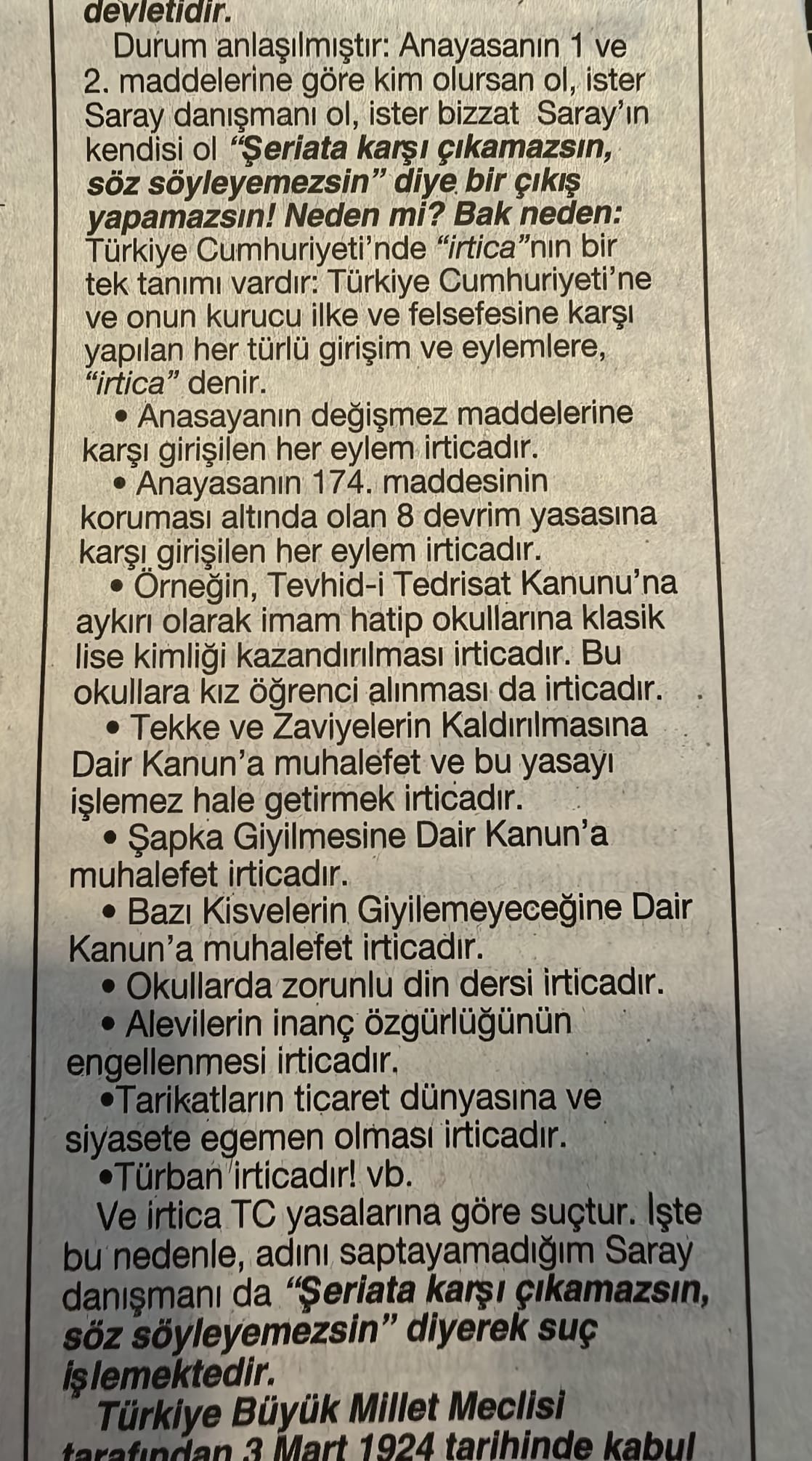Durum anlaşılmıştır: Kim olursan ol, ister Cumhuriyet yazarı ol, ister Laikçinin kendisi ol, ’İrtica’nın bir tek tanımı vardır: Çağdışılık ve despotluk..