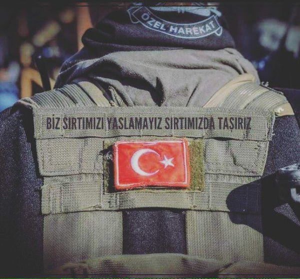 Buna karşılık özel harekat polisinin çelik yeleklerinde Türk bayrağının üzerine işlenmiş olarak "Biz sırtımızı yaslamayız sırtımızda taşırız" yazıyor.