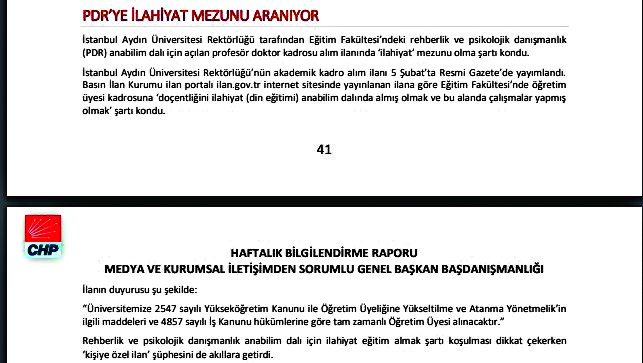 CHP Medya ve Kurumsal İletişimden Sorumlu Genel Başkan Başdanışmanlığı tarafından hazırlanan 15 Şubat-21 Şubat tarihli ‘Haftalık Bilgilendirme Raporu’nda, 67 öğretim üyesi alımı yapacağını duyuran İstanbul Aydın Üniversitesi’nin ilanında ‘doçentliğini ilahiyat (din eğitimi) anabilim dalında yapmış’ ifadesinin yer almasından duyulan rahatsızlık dile getirildi. Verdiği öğretim üyesi alımı ilanı sebebiyle özel Aydın Üniversitesi’ni fişleyen CHP, üniversiteye yalnızca ilahiyatçı alınacakmış gibi bir algı oluşturdu.