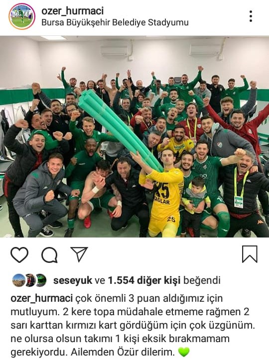 TFF 1. Lig'in 22. haftasında Adana Demirspor'u evinde 2-1 mağlup eden yeşil-beyazlılarda, karşılaşmanın 64. dakikasında ikinci sarı karttan kırmızı kartla oyundan atılan Özer Hurmacı, özür diledi.