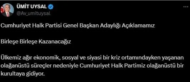 CHP'nin Antalya Muratpaşa Belediye Başkanı Ümit Uysal, 6 Nisan'da yapılacak olağanüstü kurultayda Genel Başkanlık koltuğuna aday olduğunu açıkladı. Uysal, "33 yıllık siyasi tecrübemi ve birikimimi partimin ve ülkemin hizmetine sunma cesaretiyle Cumhuriyet Halk Partisi Genel Başkan Adaylığımı açıklıyorum." diyerek CHP Genel Başkanı Özgür Özel'e rakip olduğunu açıkladı.