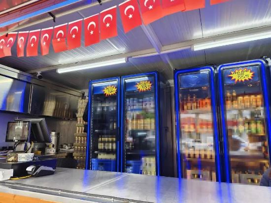 Büfenin satış bölümünde içki kolilerinin üst üste istiflendiği görüldü. Bu durum, alkolün reklamının yapılmasını yasaklayan 4250 sayılı kanuna aykırı.