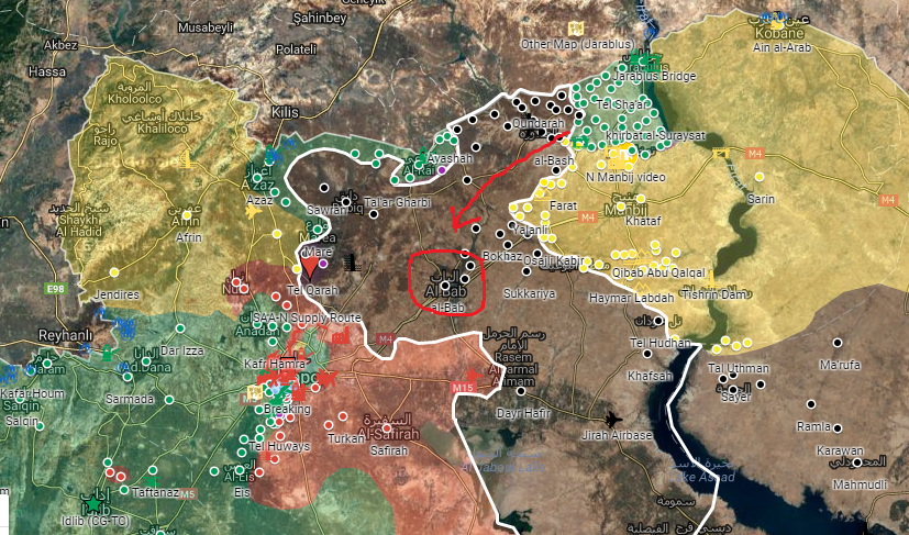 Özgür Suriye Ordusu'nun Türkiye'nin Cerablus'a düzenlediği Fırat Harekatı kapsamında Cerablus'tan güneye doğru ilerleyişi sürüyor. PYD unsurlarına ait çok sayıda köy ve kasabanın alınmasından sonra ÖSO kuvvetleri Münbiç'e 20 km kuzeyde Saruc çayında durdu. Yetkililere göre, operasyonun yönü DAEŞ'in elinde bulunan El-Bab şehrine doğru kayacak.