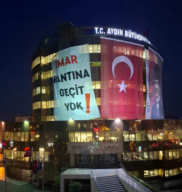 Aydın Büyükşehir Belediye Başkanı Özlem Çerçioğlu, CHP Genel Başkanı Özgür Özel’in katıldığı miting alanına, “İmar rantına geçit yok” ifadesinin yer aldığı bir pankart astırdı.