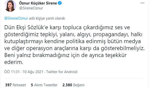 Sirene sözlerini şu çağrı ile tamamladı: "Dün Ekşi Sözlük'e karşı topluca çıkardığımız ses ve gösterdiğimiz tepkiyi; yalanı, algıyı, propagandayı, halkı kutuplaştırmayı kendine politika edinmiş bütün medya ve diğer operasyon araçlarına karşı da gösterebilmeliyiz."
