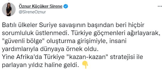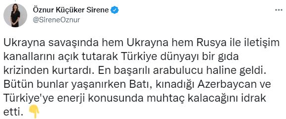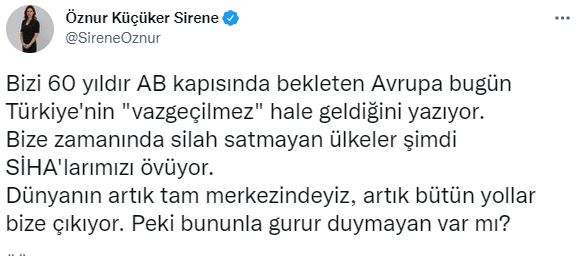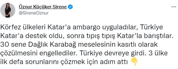 Sirene, sosyal medya hesabı üzerinden yaptığı paylaşımda, “Körfez ülkeleri Katar'a ambargo uyguladılar, Türkiye Katar'a destek oldu, sonra tıpış tıpış Katar'la barıştılar. 30 sene Dağlık Karabağ meselesinin kasıtlı olarak çözülmesini engellediler. Türkiye devreye girdi. 3 ülke ilk defa sorunlarını çözmek için adım attı. Batılı ülkeler Suriye savaşının başından beri hiçbir sorumluluk üstlenmedi. Türkiye göçmenleri ağırlayarak, "güvenli bölge" oluşturma girişimiyle, insani yardımlarıyla dünyaya örnek oldu. Yine Afrika'da Türkiye "kazan-kazan" stratejisi ile parlayan yıldız haline geldi. Ukrayna savaşında hem Ukrayna hem Rusya ile iletişim kanallarını açık tutarak Türkiye dünyayı bir gıda krizinden kurtardı. En başarılı arabulucu haline geldi. Bütün bunlar yaşanırken Batı, kınadığı Azerbaycan ve Türkiye'ye enerji konusunda muhtaç kalacağını idrak etti. Bizi 60 yıldır AB kapısında bekleten Avrupa bugün Türkiye'nin "vazgeçilmez" hale geldiğini yazıyor. Bize zamanında silah satmayan ülkeler şimdi SİHA'larımızı övüyor. Dünyanın artık tam merkezindeyiz, artık bütün yollar bize çıkıyor. Peki bununla gurur duymayan var mı?” ifadelerini kullandı.