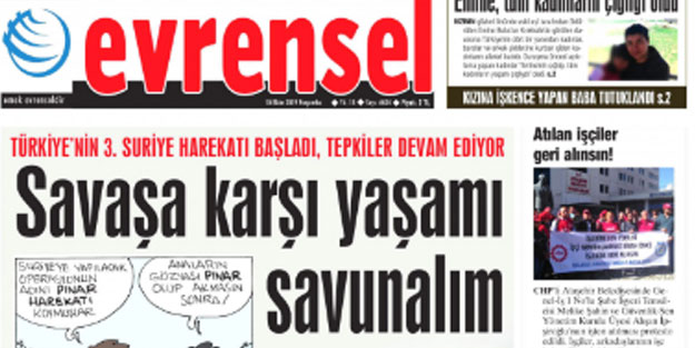 İşçi ve emekçilerin hakkını savunma iddiasyla PKK propagandası yapan bir diğer gazete olan Evrensel de Barış Pınarı Harrekâtı'ndan rahatsız oldu. Sözde gazete, attığı manşette, "Savaşa karşı barışı savunalım" başlığını kullandı.
