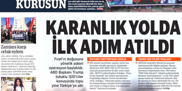 Terör örgütü PKK'nın paçavrası Birgün, Suriye'de Fırat'ın doğusundaki terör kamplarını imha etmek için başlatılan Barış Pınarı Harekâtı'nı, "Karanlık yolda ilk adım atıldı" başlığıyla duyurdu.