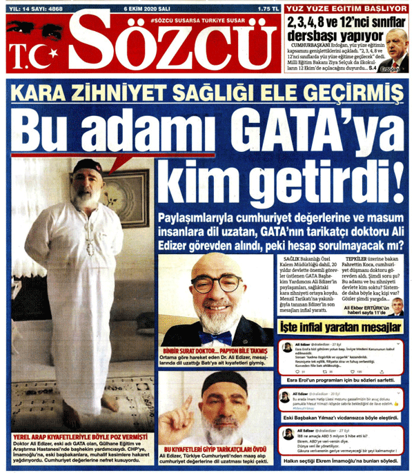 Türk - İslam toplum yapısına karşı her türlü saldırıyı meşru gören Sözcü paçavrası, batıl ideolojisinin getirdiği ikiyüzlü haber politikasını bir kez daha gözler önüne serdi. Bir süre önce, “Gül gibi bir yuva yıkılmış, neden boşanmışlar? Niye? ‘Koca aldattı’ diye. Ayıptır, günahtır. Niye aldatıyorsunuz? Allah size ruhsat vermiş. Aldınız, bir başkasını da sevdiniz onu da alın. İnsan yuvasını yıkar mı?” dediği için laikçi linçe maruz kalan doktor Ali Edizer’i bugün manşetine taşıyan Sözcü, “Kara zihniyet sağlığı ele geçirmiş, bu adamı Gata’ya kim getirdi?” başlıklı haberinde, “Paylaşımlarıyla cumhuriyet değerlerine ve masum insanlara dil uzatan, GATA'nın tarikatçı doktoru Ali Edizer görevden alındı, peki hesap sorulmayacak mı?” ifadelerini kullanarak doktoru hedef gösterdi.