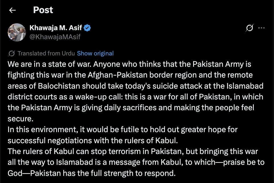 “Savaş halindeyiz” diyen Pakistan Savunma Bakanı Khawaja Muhammed Asif , “Kabil’in yöneticileri Pakistan’daki terörü durdurabilir, ancak bu savaşı İslamabad’a kadar taşımaları, doğrudan bir mesajdır” diye konuştu.