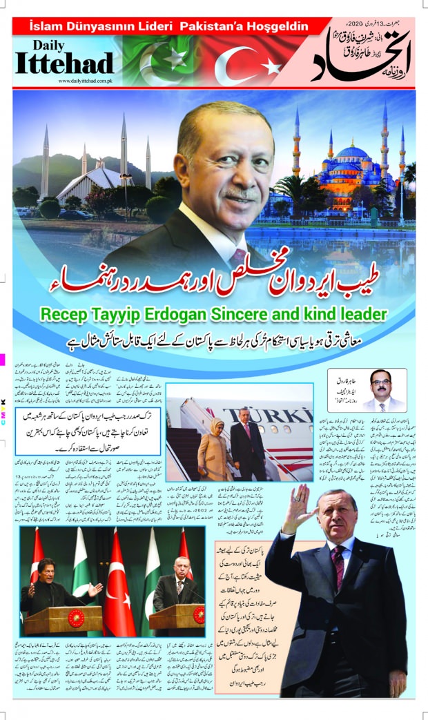 Pakistan’nın yüksek trajlı gazetelerinden Daily Ittehad, Cumhurbaşkanı Recep Tayyip Erdoğan’ın İslamabad’a gelişini Türkçe "İslam dünyasının lideri Pakistan’a hoş geldin" ifadeleri ile okuyucularına duyurdu.