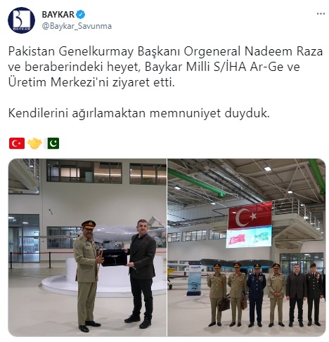 BAYKAR’ın resmi Twitter hesabından yapılan açıklamada, "Pakistan Genelkurmay Başkanı Orgeneral Nadeem Raza ve beraberindeki heyet, Baykar Milli S/İHA Ar-Ge ve Üretim Merkezi’ni ziyaret etti. Kendilerini ağırlamaktan memnuniyet duyduk" ifadelerine yer verildi.