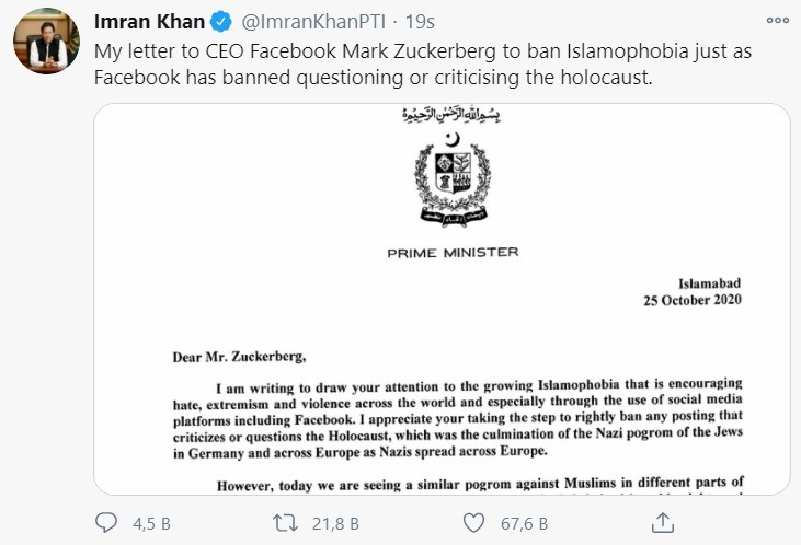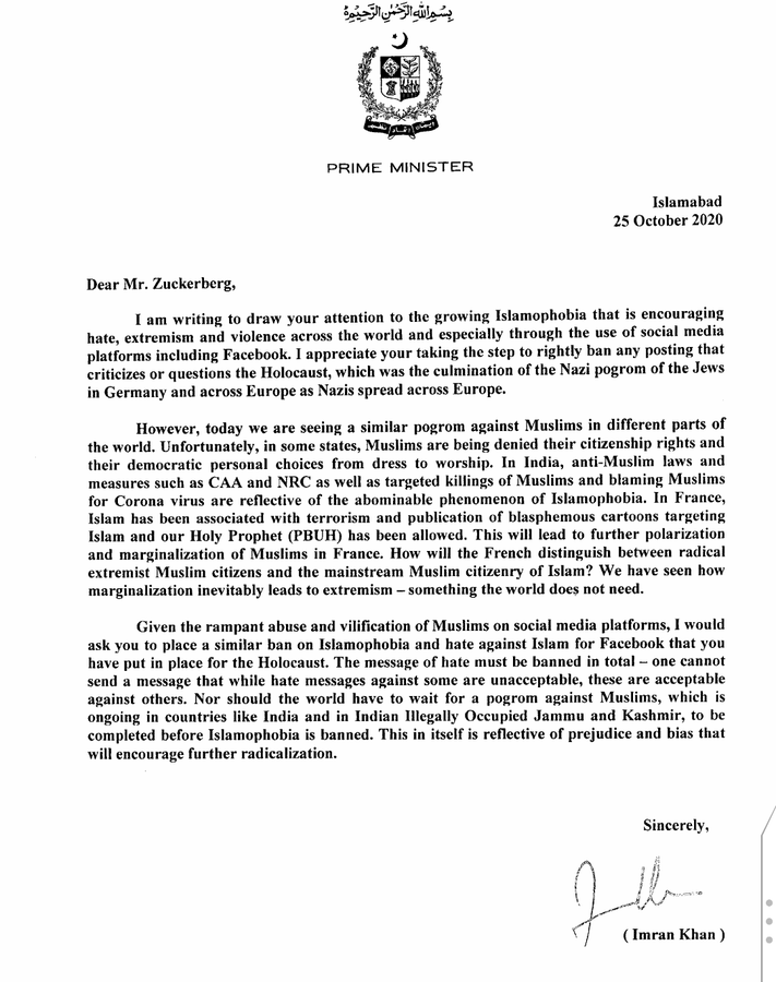Pakistan Başbakanı Han, Twitter hesabından paylaştığı mektupta, artan İslam karşıtlığının aşırılık yanlısı grupları ve dünya genelinde şiddeti arttırdığını ifade etti. Han, mektubunu, Facebook kurucusu ve sahibi Mark Zuckerberg'e hitaben yazdı.