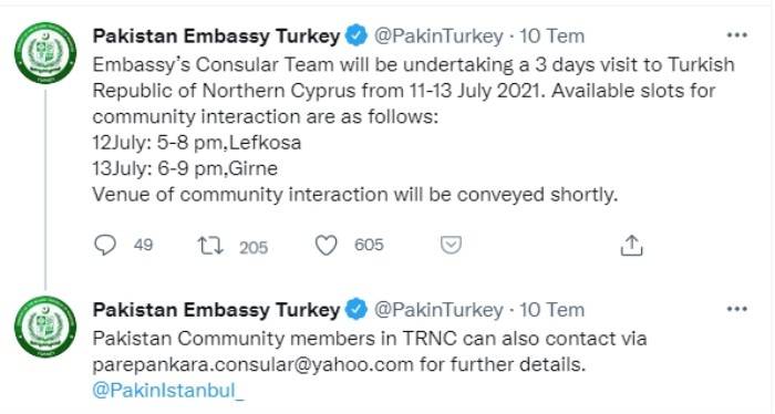 Pakistan'ın Türkiye Büyükelçiliği, sosyal medya hesabından konsolosluk heyetinin 11-13 Temmuz tarihleri arasında KKTC'ye 3 günlük bir ziyaret gerçekleştireceğini duyurdu.