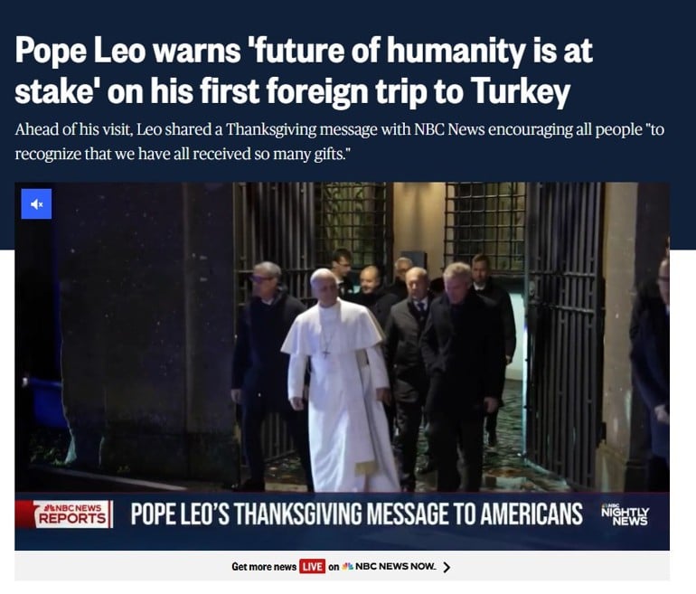 "Papa 14. Leo, Türkiye ziyaretinde dünyanın “küresel ölçekte artan bir çatışma düzeyine teslim olmaması gerektiği” uyarısında bulundu. Papa, “İnsanlığın geleceği tehlikede” diyerek, diyalog ve istikrarın teşvik edilmesi gerektiğine dikkat çekip Cumhurbaşkanı Recep Tayyip Erdoğan’ın istikrar kaynağı olarak rol üstlenmesi çağrısında bulundu.