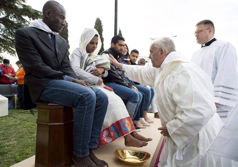 Katoliklerin ruhani lideri Papa Francis, pazar günü kutlanacak Paskalya Yortusu öncesi ayak yıkama ritüeli için İtalya'nın başkenti Roma yakınlarındaki Castelnuovo di Porto'da 900 kadar sığınmacının bulunduğu kampa gitti. 12 sığınmacı ve 1 İtalyan'ın ayaklarını yıkayarak havluyla kurulayan Papa sığınmacıların ayaklarını tek tek öptü.