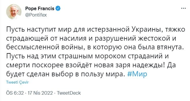 Ayrıca Papa bu mesajını Twitter’dan Rusça paylaştı.