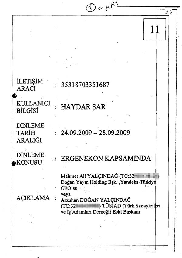 Aydın Doğan’ın kızı ve Doğan Holding Yönetim Kurulu Başkanı Arzuhan Doğan Yalçındağ ve Aydın Doğan’ın damadı ve Yandex.Türkiye Yönetim Kurulu Başkanı Mehmet Ali Yalçındağ da, paralel yapı tarafından “Haydar Şar” sahte ismiyle dinlenmiş.