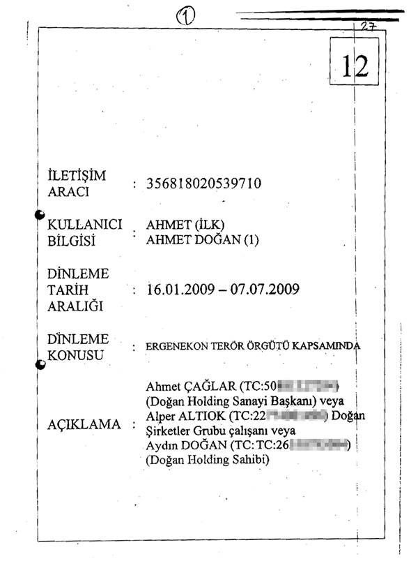 Aydın Doğan’ın “Ahmet” ve “Ahmet Doğan” sahte ismiyle dinlenmesine ve teknik takibe alınmasına yönelik talepte bulunmuş.