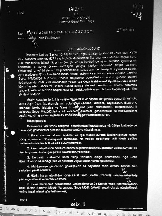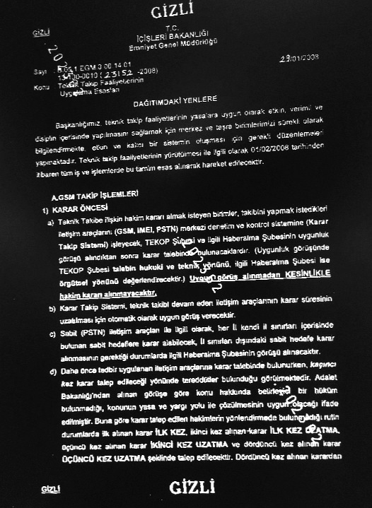 29.1.2008 tarihli Ramazan Akyürek imzalı tamimde, "Takibi yapılmak istenen iletişim araçları merkezi denetim ve kontrol sistemine (Karar Takip Sistemi) işlenmek suretiyle Tekop şubesi ve ilgili Haberalma şubesinin uygun görüşü alındıktan sonra mahkemeden karar talebinde bulunulması, uygun görüş alınmadan kesinlikle hakim kararı alınmayacaktır. Karar Takip Sistemi teknik olarak takibi devam eden iletişim araçlarının karar süresinin uzatılması için otomatik olarak uygun görüş verecektir" ifadelerinin yer aldığı görüldü.