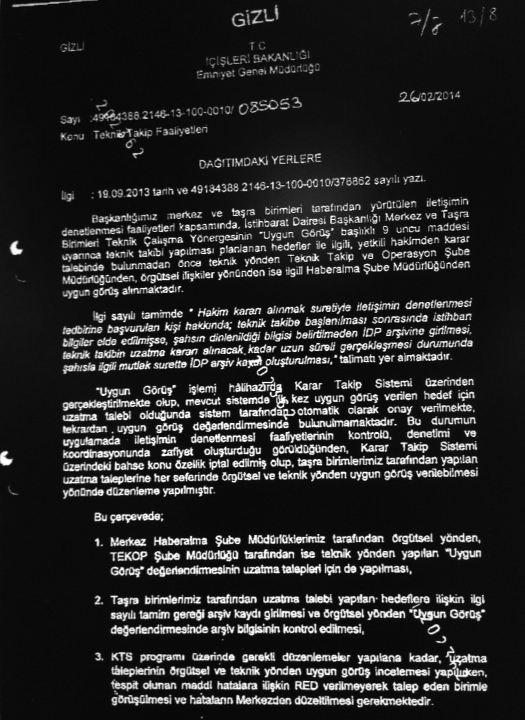 19.9.2013 Engin Dinç imzalı tamimde, "Haberalma şube müdürlüklerinin örgütsel yönden uygun görüş incelemesinin detaylı bir şekilde yapılmalı, konunun bizzat şube müdürleri tarafından takip edilerek uzman personele Karar Takip Sistemi (KTS) üzerinden onay yetkisi talep edilmeli. Merkez ve taşra birimleri tarafından uygun görüş alınmadan kesinlikle mahkemeden karar talebinde bulunulmamalı, uygun görüş sorulan iletişim araçlarının gerekçe açıklamaları mevzuata uygun ifadelerle yazılmalı, onay verecek birim istediğinde teknik takip gerekçesini detaylı olarak gönderilmeli" şeklinde bir değişiklik yapıldığı görüldü.