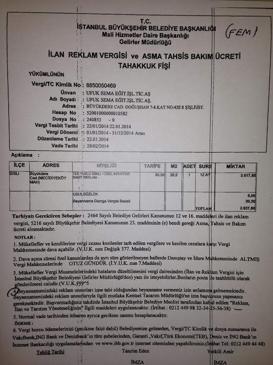 Zira sözü edilen makbuz, yani İlan Reklam Vergisi ve Asma Tahsis Bakım Ücreti Tahakkuk Fişi'nde çok açık bir ibare yer alııyor.