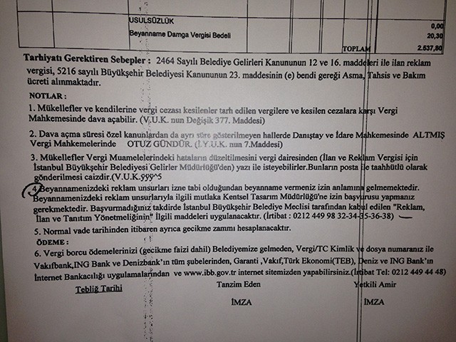 Fişteki ifade şu şekilde: Beyannamenizdeki reklam unsurları izne tabi olduğundan beyanname vermeniz izin anlamına gelmemektedir. Beyannamenizdeki reklam unsurlarıyla ilgili mutlaka Kentsel Tasarım Müdürlüğü'ne izin başvurusu yapmanız gerekmektedir. Başvurmadığınız takdirde İstanbul Büyükşehir Belediye Meclisi tarafından kabul edilen "Reklam, İlan ve Tanıtım Yönetmeliğinin ilgili maddeleri uygulanacaktır"