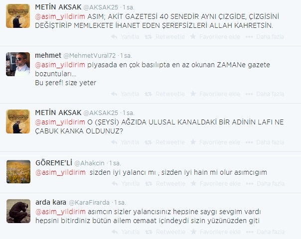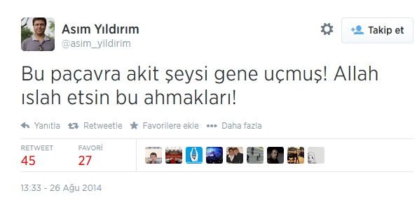 YENİAKİT.COM.TR - İhanet çetesinin 'Romantik paraleli' Asım yıldırım gazetemiz AKİT'in dinlerarası diyaloğa şiddetle karşı olan İsmailağa Cemaati'nin önde gelen isimlerinden Bayram Ali Öztürk Hocaefendi'nin şehid edilmesiyle ilgili ''Bayram Ali Hocayı Paralel mi katletti?" haberine cevap veremeyerek ağzını bozdu. Twitter hesabından hakaretamiz paylaşımda bulunan Yıldırım'a takipçilerinden çok fazla tepki geldi.