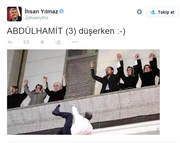 Yılmaz, Cumhurbaşkanı Erdoğan'ın balkondan düştüğü bir 'Fetoşop' yaparak, "Abdulhamit (3) düşerken" yorumunda bulundu. Skandal yorumun, Yılmaz'ın takipçileri tarafından da büyük tepki aldığı görüldü.