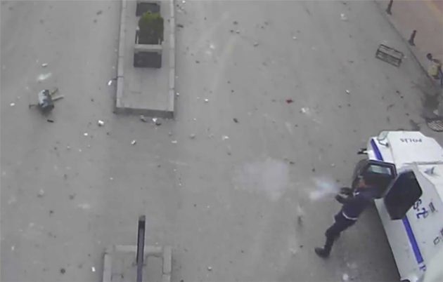 Van’da polis panzerinin, yanması için araçları alevlere sürüklediği sırada başka bir polisin de olayların aksi istikametteki evlerin pencerelerine doğru peşpeşe gaz bombaları attığı görüldü.