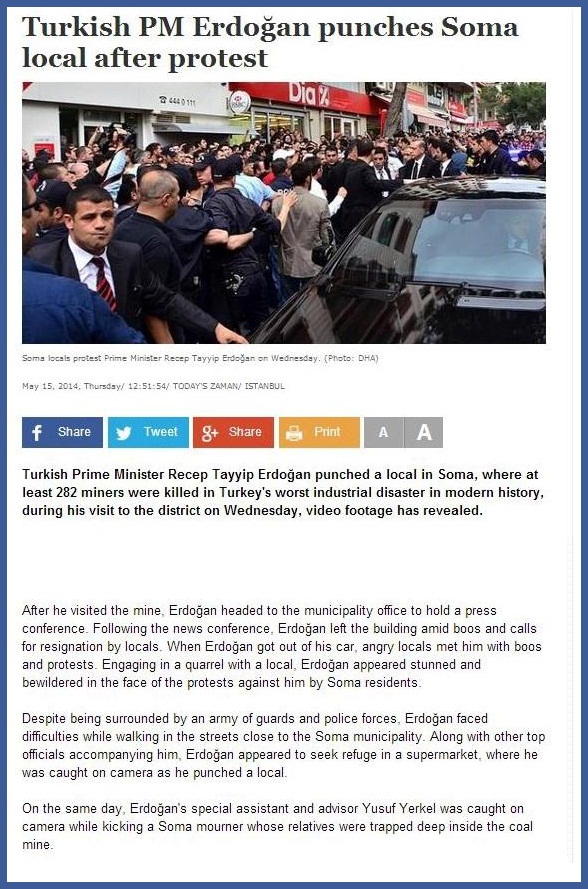 Gazete dün Soma’ya giden Başbakan Tayyip Erdoğan’ın bir grup provokatör tarafından protesto edilmesini yerli halk tarafından yapılmış gibi sunarak Erdoğan’ın öfkeyle olay yerinden kaçtığını yazdı. Today’s Zaman, Başbakan Erdoğan’ın aracından öfkeyle inerek bir vatandaşla tartıştığını iddia etti. Gazete, Erdoğan, markete ilerleyip yerel halktan birisini markette yumrukladığı iftirasında bulundu.