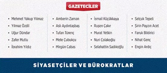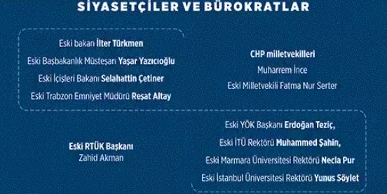 Siyasetçiler ve bürokratların da yer aldığı listede eski bakanlardan İlter Türkmen, CHP milletvekilleri Fatma Nur Serter, Muharrem İnce, Erdoğan Teziç ile Eski RTÜK Başkanı Zahid Akman ile bazı rektörlerin de bulunduğu belirlendi.