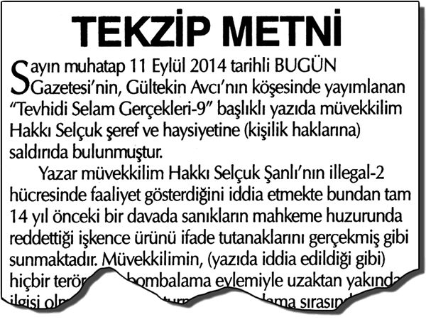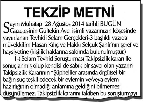 YENİAKİT.COM.TR - "Fetullah Gülen'in bir gülüşüne servetimi bağışlarım" diyen Akın İpek'in sahibi olduğu Bugün gazetesinde yazan Gültekin Avcı'nın "Tevhid-i Selam Gerçekleri" başlığı ile yayınladığı köşe yazılarının yalan olduğu ispatlandı.
