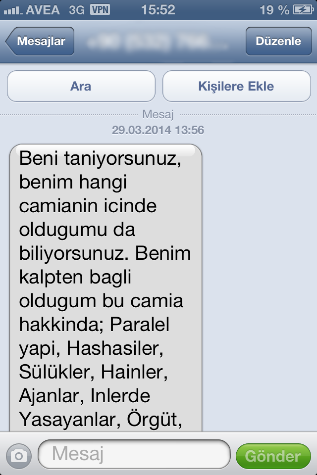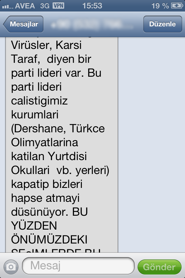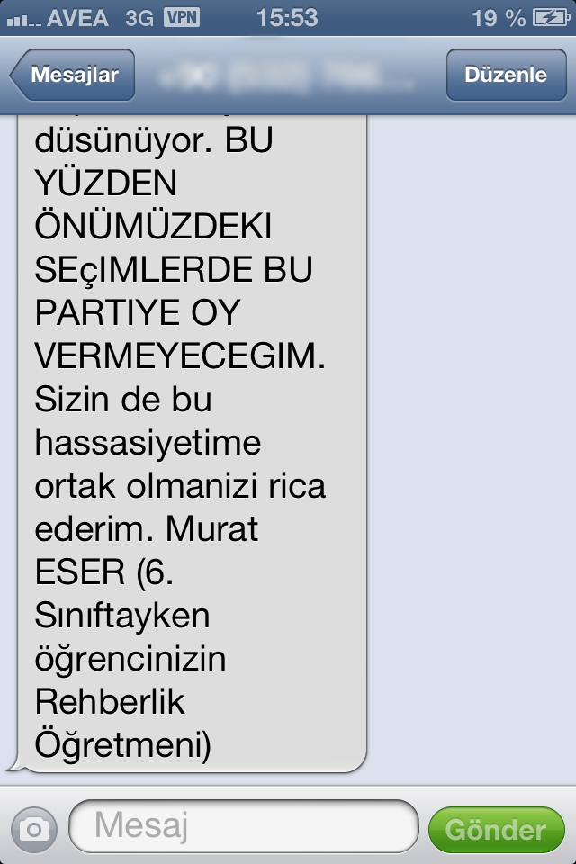 “Beni tanıyorsunuz,benim hangi camianın içinde olduğumu da biliyorsunuz. Benim kalpten bağlı olduğum bu camia hakkında; Paralel yapı, Haşhaşiler, Sülükler, Hainler, Ajanlar, İnlerde Yaşayanlar, Örgüt, Virüsler, Karşı Taraf, diyen bir parti lideri var. Bu parti lideri çalıştığımız kurumları (Dershane, Türkçe Olimpiyatlarına katılan Yurtdışı Okulları vb. yerleri) kapatıp bizleri hapse atmayı düşünüyor.Bu yüzden önümüzdeki seçimlerde bu partiye oy vermeyeceğim.Sizin de bu hassasiyetime ortak olmanı rica ederim. Murat Eser. 6.Sınıftayken öğrencinizin Rehberlik Öğretmeni”