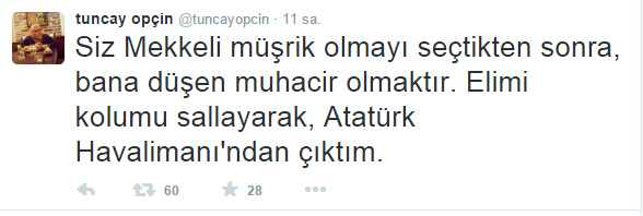 Cemaat'in önemli isimlerinden Tuncay Opçin, yurtdışına kaçtı. Opçin, “Siz Mekkeli müşrik olmayı seçtikten sonra, bana düşen muhacir olmaktır. Elimi kolumu sallayarak, Atatürk Havalimanı'ndan çıktım” dedi.