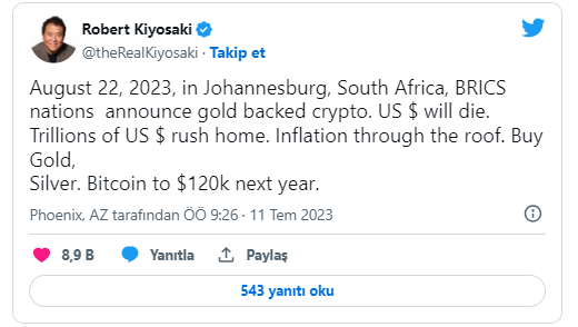 Son paylaşımında Kiyosaki, Brezilya, Rusya, Hindistan, Çin ve Güney Afrika’dan oluşan BRICS ittifakının üyelerinin altın standardını benimseme yönündeki son hamlesine değiniyor. Bu ulusların yakın gelecekte altın destekli bir kripto para birimini piyasa süreceğini vurguluyor. Kiyosaki’ye göre bu hamle günümüzün rezerv para birimi ABD dolarının (USD) değerini önemli ölçüde etkileyecek. Hatta küresel para birimi statüsüne bile meydan okuyacak.