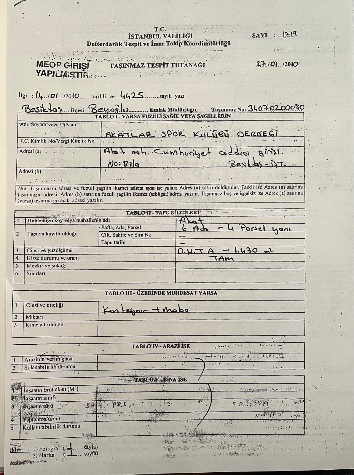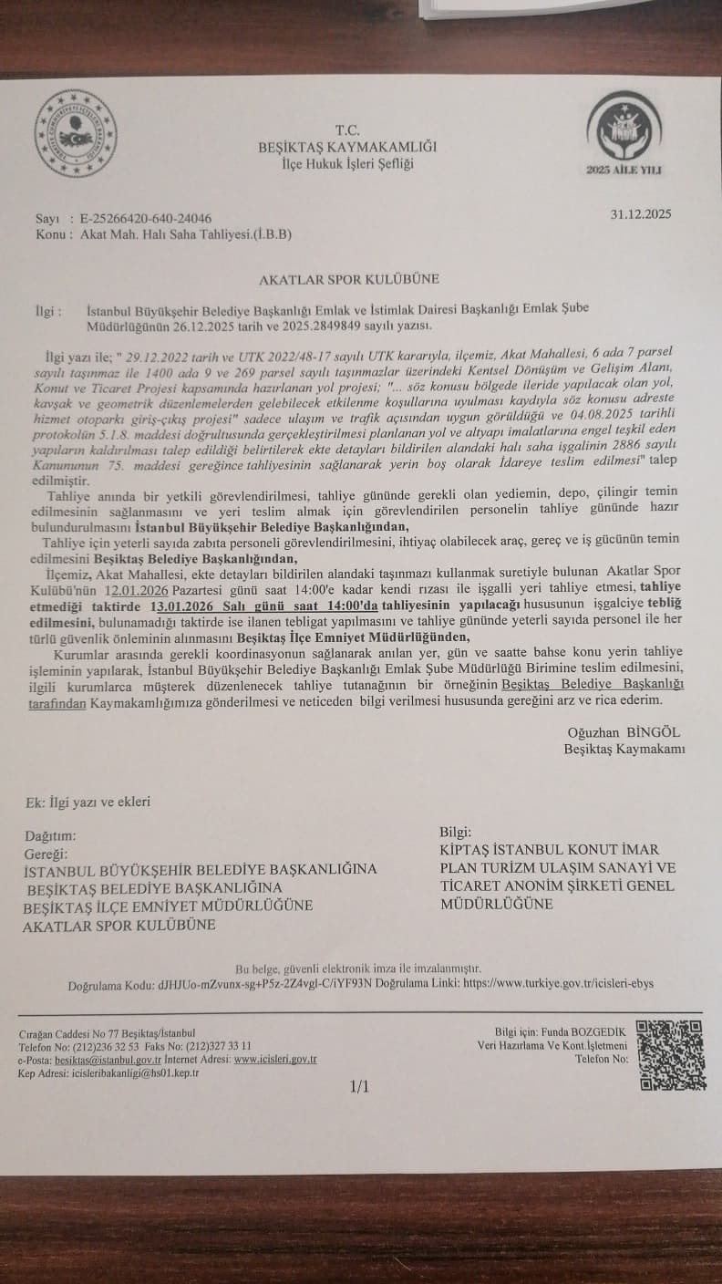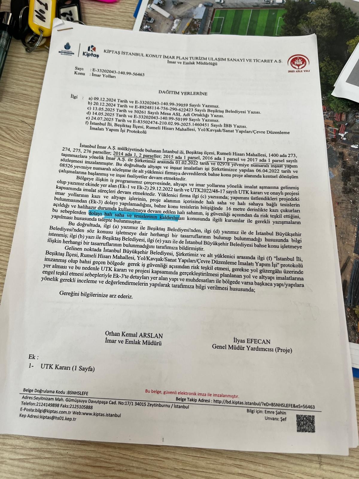 Diğer yandan yüklenici firmanın, Rumeli Hisarı Mahallesi’ndeki inşaat çalışmalarına daha fazla alan açılabilmesi için KİPTAŞ’a başvurduğu; söz konusu Beşiktaş Akatlar Spor Kulübü arsasının ve bağlı tesislerin kazı ve altyapı çalışmalarına engel teşkil ettiğini bildirdiği aktarıldı. Bu kapsamda, kavşak yapımı ve iş güvenliği riski gerekçeleri öne sürülerek halı sahanın kaldırılması için ilgili kurumlarla yazışma yapılmasının talep edildiği ifade edildi.