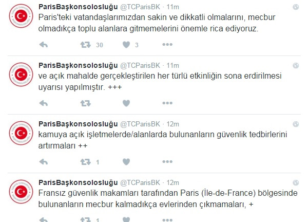 Türkiye'nin Paris Başkonsolosluğu'nun Twitter'daki hesabından, "Fransız güvenlik makamları tarafından Paris (İle-de-France) bölgesinde bulunanların mecbur kalmadıkça evlerinden çıkmamaları, kamuya açık işletmelerde/alanlarda bulunanların güvenlik tedbirlerini artırmaları ve açık mahalde gerçekleştirilen her türlü etkinliğin sona erdirilmesi uyarısı yapılmıştır. Paris'teki vatandaşlarımızdan sakin ve dikkatli olmalarını, mecbur olmadıkça toplu alanlara gitmemelerini önemle rica ediyoruz." uyarısı yapıldı.