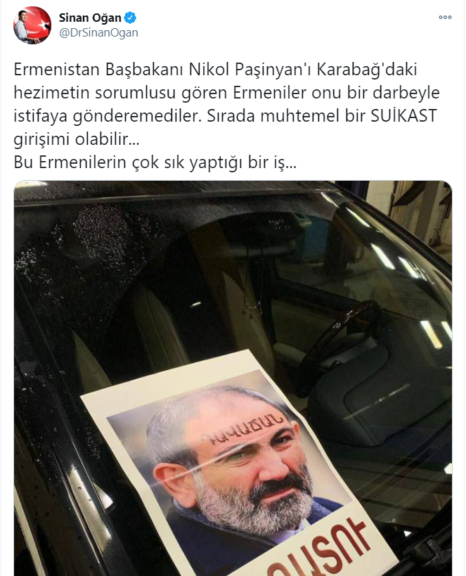 Dr. Sinan Oğan sosyal medya hesabından yaptığı açıklamada, "Ermenistan Başbakanı Nikol Paşinyan'ı Karabağ'daki hezimetin sorumlusu gören Ermeniler onu bir darbeyle istifaya gönderemediler. Sırada muhtemel bir suikast girişimi olabilir... Bu Ermenilerin çok sık yaptığı bir iş..." dedi.