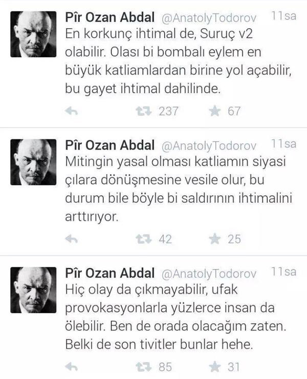Ankara'daki terör saldırısından 9 saat önce "@DrBereday" kullanıcı adlı bir hesaptan, " 'Bomba' Ankara'da patlayacak!..", "IŞİD Ankara’da patlatmasın?!" ve "Ankara'da yapılacak eylemde IŞİD adı alında müdahele olabilir. Bunu engellemenin yolu Sol örgütlerin direct müdahalesidir. PKK yok bu işte"mesajları atıldı.