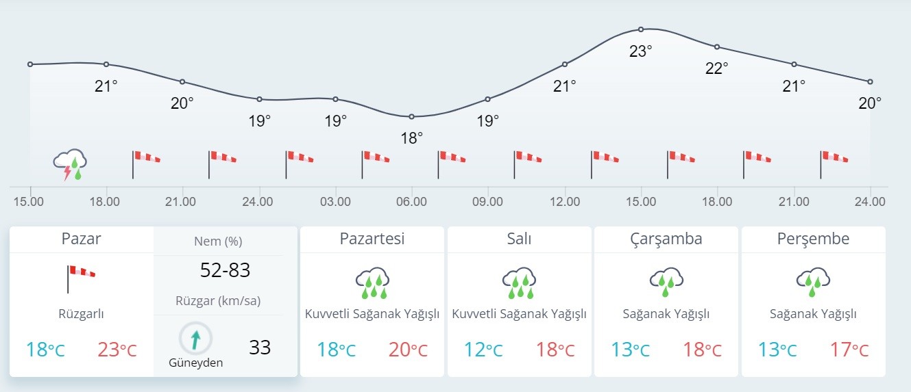 20.11.2022 Pazar günü Marmara ve Kuzey Ege'de rüzgarın güney ve güneybatı yönlerden kuvvetli (40-60 km/saat), Marmara'nın güneyi ile İzmir'in ve Manisa'nın kuzeyinde zaman zaman hamleli kısa süreli fırtına (60-80 km/saat) şeklinde esmesi bekleniyor. Soba ve doğalgaz kaynaklı baca gazı zehirlenmesi, ulaşımda aksamalar, ağaç ve direklerin devrilmesi ve çatı uçması gibi olumsuzluklara karşı dikkatli ve tedbirli olunmalıdır.