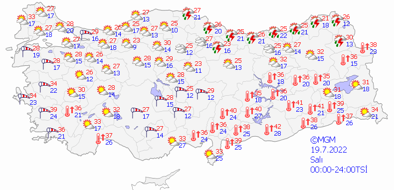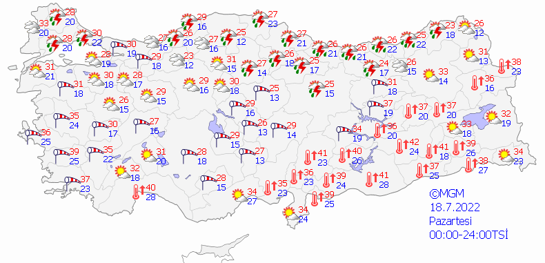 Meteoroloji Genel Müdürlüğü tarafından yapılan son değerlendirmelere göre: Ülkemizin kuzey ve iç kesimlerinin parçalı, yer yer çok bulutlu; Doğu Karadeniz kıyıları, Samsun’un doğu kesimleri ile Tokat ve Ordu çevrelerinin sağanak yağışlı, diğer yerlerin az bulutlu ve açık geçeceği tahmin ediliyor. Yağışların gece saatlerinde Samsun’un doğu kesimleri, Ordu ve Giresun çevrelerinde yerel olarak kuvvetli olması bekleniyor. Rüzgarın Marmara’nın güneybatısı, Ege kıyıları, Orta Akdeniz ile Doğu Anadolu’nun batısında yer yer kuvvetli (40-60 km/saat) eseceği tahmin ediliyor.