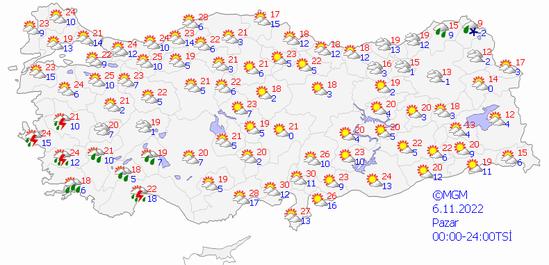 Meteoroloji Genel Müdürlüğü tarafından yapılan son değerlendirmelere göre: Ülkemizin kuzey, iç ve batı kesimlerinin parçalı ve yer yer çok bulutlu, Rize’nin iç kesimleri, Artvin ve Ardahan çevrelerinin yağmur ve sağanak, yüksek kesimlerinin yer yer karla karışık yağmur ve kar yağışlı, yarın (Pazar) sabah saatlerinden itibaren Muğla çevreleri ile öğle saatlerinden itibaren İzmir, Aydın ve Antalya çevrelerinin sağanak ve gök gürültülü sağanak yağışlı, diğer yerlerin az bulutlu ve açık geçeceği tahmin ediliyor. Yağışların; Muğla çevrelerinde yer yer kuvvetli olması bekleniyor. Gece ve sabah saatlerinde Marmara, İç Ege, İç Anadolu ile Batı ve Orta Karadeniz'in iç kesimlerinde pus ve yer yer sis bekleniyor.
