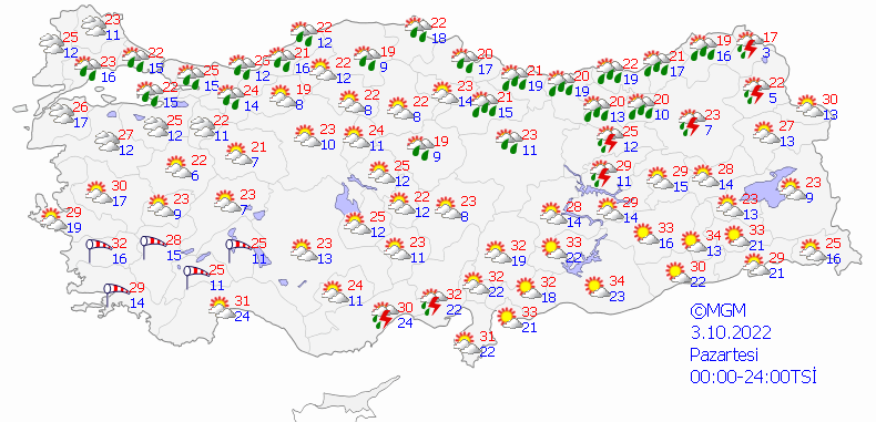 Meteoroloji Genel Müdürlüğü tarafından yapılan son değerlendirmelere göre: Ülkemizin kuzey, iç ve doğu kesimlerinin parçalı ve yer yer çok bulutlu, Karadeniz, Mersin, Adana, Sivas, Erzincan, Erzurum, Kars ve Ardahan çevrelerinin sağanak ve gök gürültülü sağanak yağışlı, diğer yerlerin az bulutlu ve açık geçeceği tahmin ediliyor. Yağışların: Doğu Karadeniz, Orta Karadeniz kıyıları ile Zonguldak, Bartın, Karabük, Kastamonu ve Tokat çevrelerinde kuvvetli olması bekleniyor.