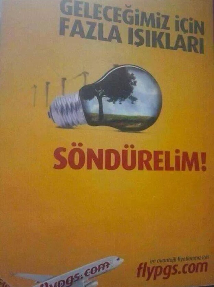 YENİAKİT.COM.TR - FLY PGS'nin kurum içine astığı 'uyarı panosu' tepkileri de beraberinde getirdi. Pano üzerinde AK Parti'ye göndermede bulunularak 'geleceğimiz için fazla ışıkları söndürelim' yazısı yazıldı.